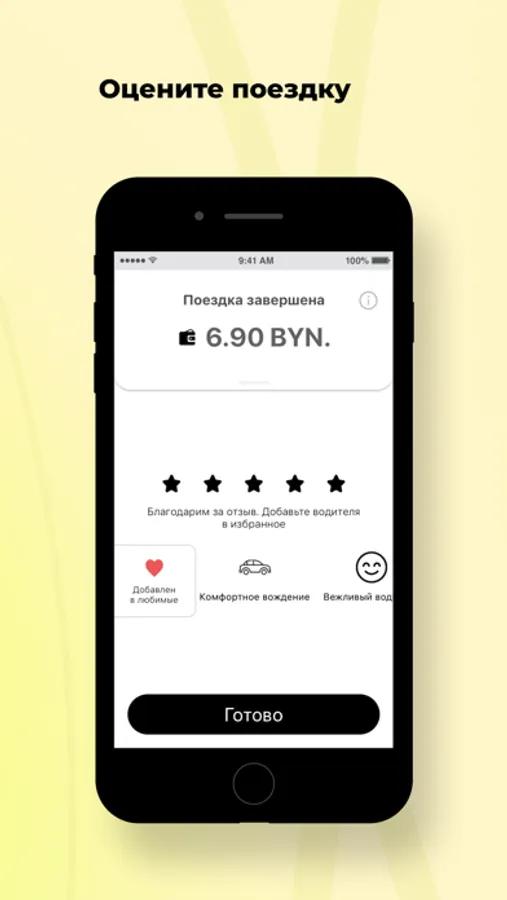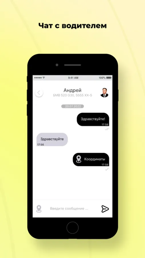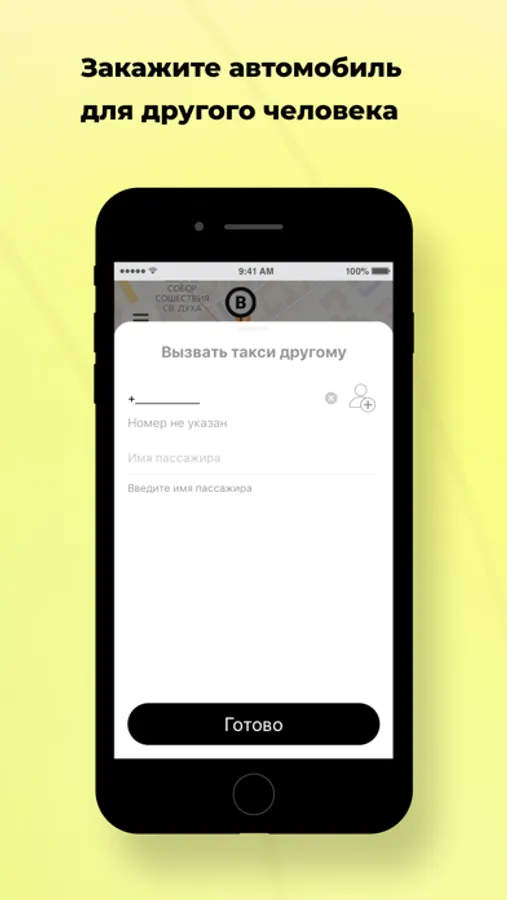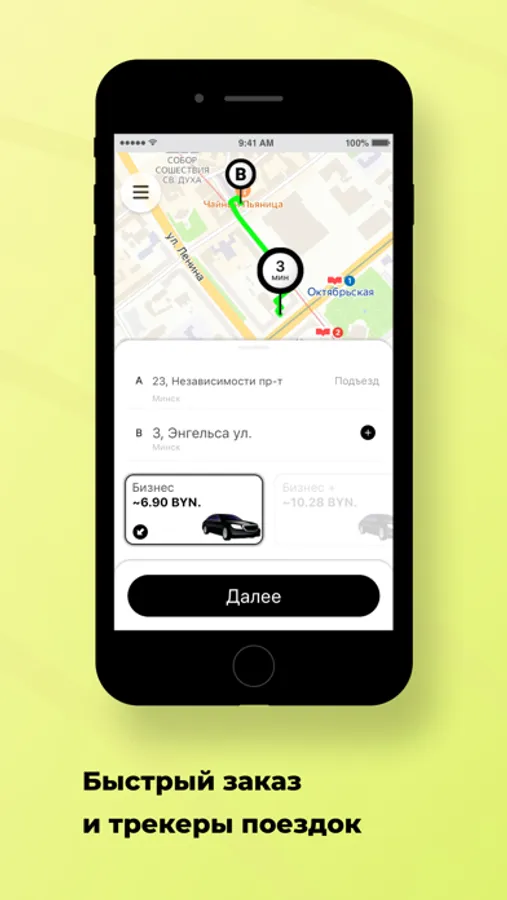 Следите за поездкой на карте. Приложение сообщит время подачи, марку, цвет, номер машины, а также имя водителя.