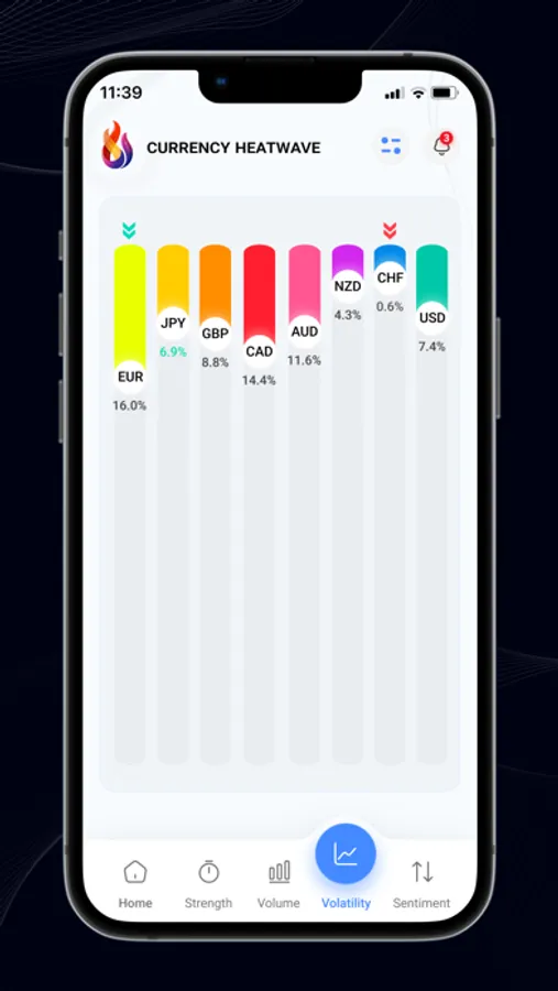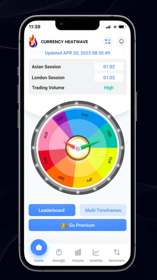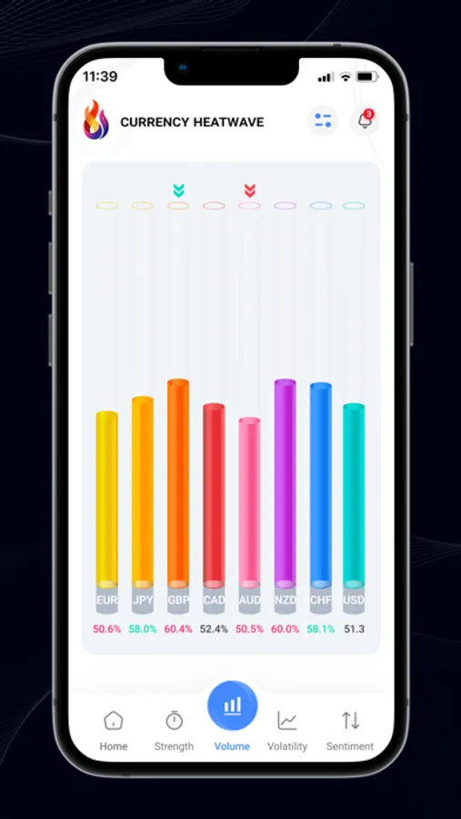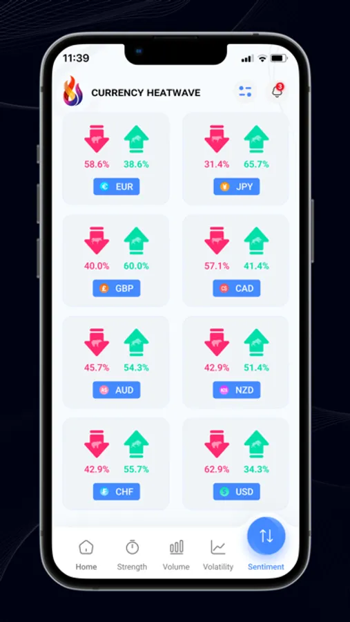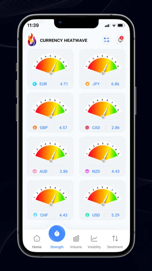 The app has 6 screens covering 4 important aspects of trading that is Currency Strength, Volume, Volatility and Sentiment.