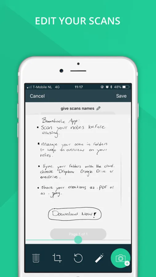 Scan your notes with the push of a button. All Bambook products have a black border around them. This black trim is recognized by the app, due to which it captures purely the page and not the surroundings. The app captures the page and converts it to a black and white scan. You can also use other filters if you would prefer your scan to be in colour.
