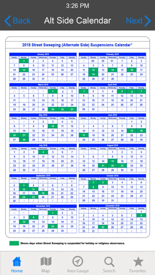 An Alternate Side Suspension Days Calendar page shows you days you don't have to move your car for street sweeping.