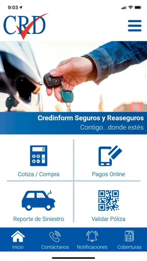 Con nuestra aplicación podrás regístrate o si ya eres usuario de nuestra plataforma, tendrás las ventajas de realizar cotizaciones, reportar siniestros, ver nuestros puntos de pago y encontrar la oficina más cercana, también podrás realizar la cancelación de tus pólizas. Descarga la aplicación y prueba la experiencia de la aplicación móvil de Seguros y Reaseguros Credinform International SA.