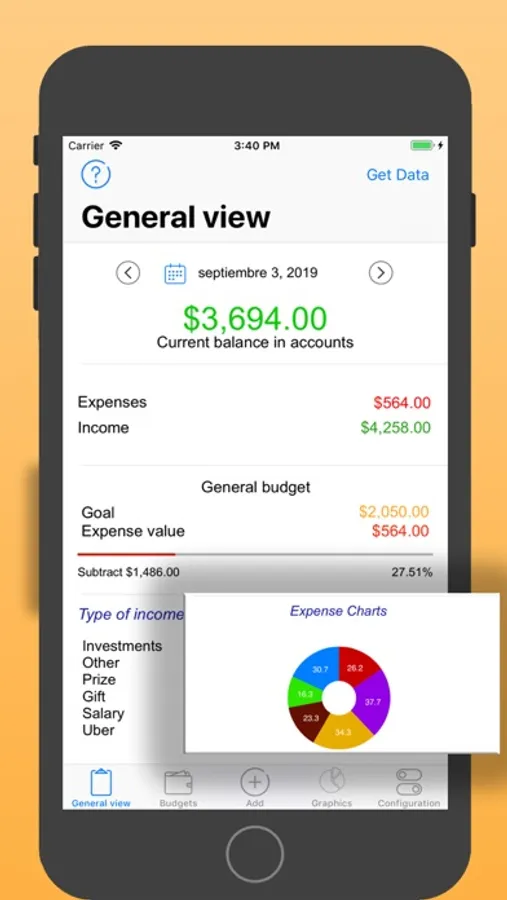 GRAPHICS: Watch your economy with graphics: Show and compare your expenses and income to know where to save money.