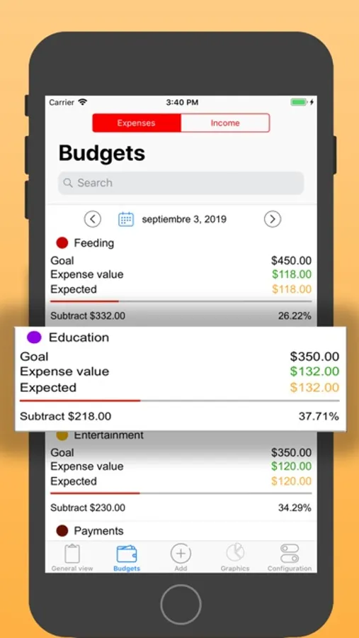 - Option to create categories or Type of expenses or Types of Income to your liking. Each category has its color to adjust, which makes everything more clear.
