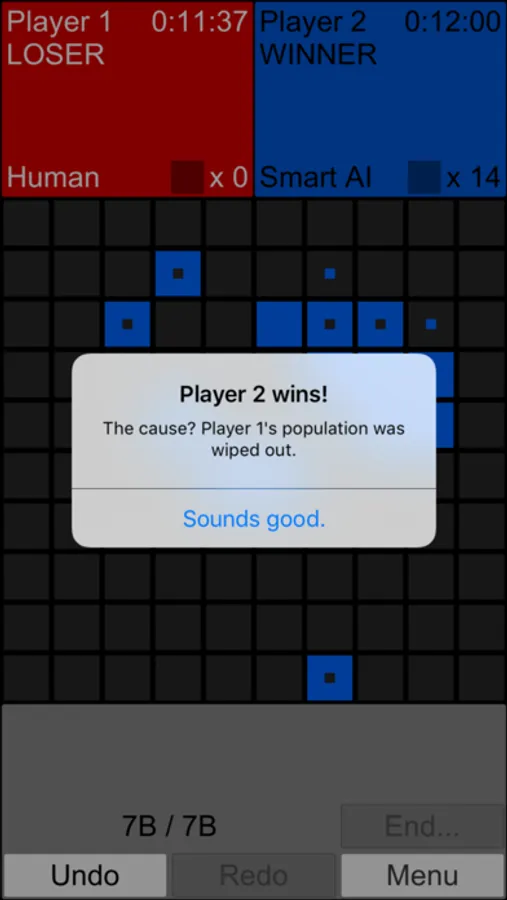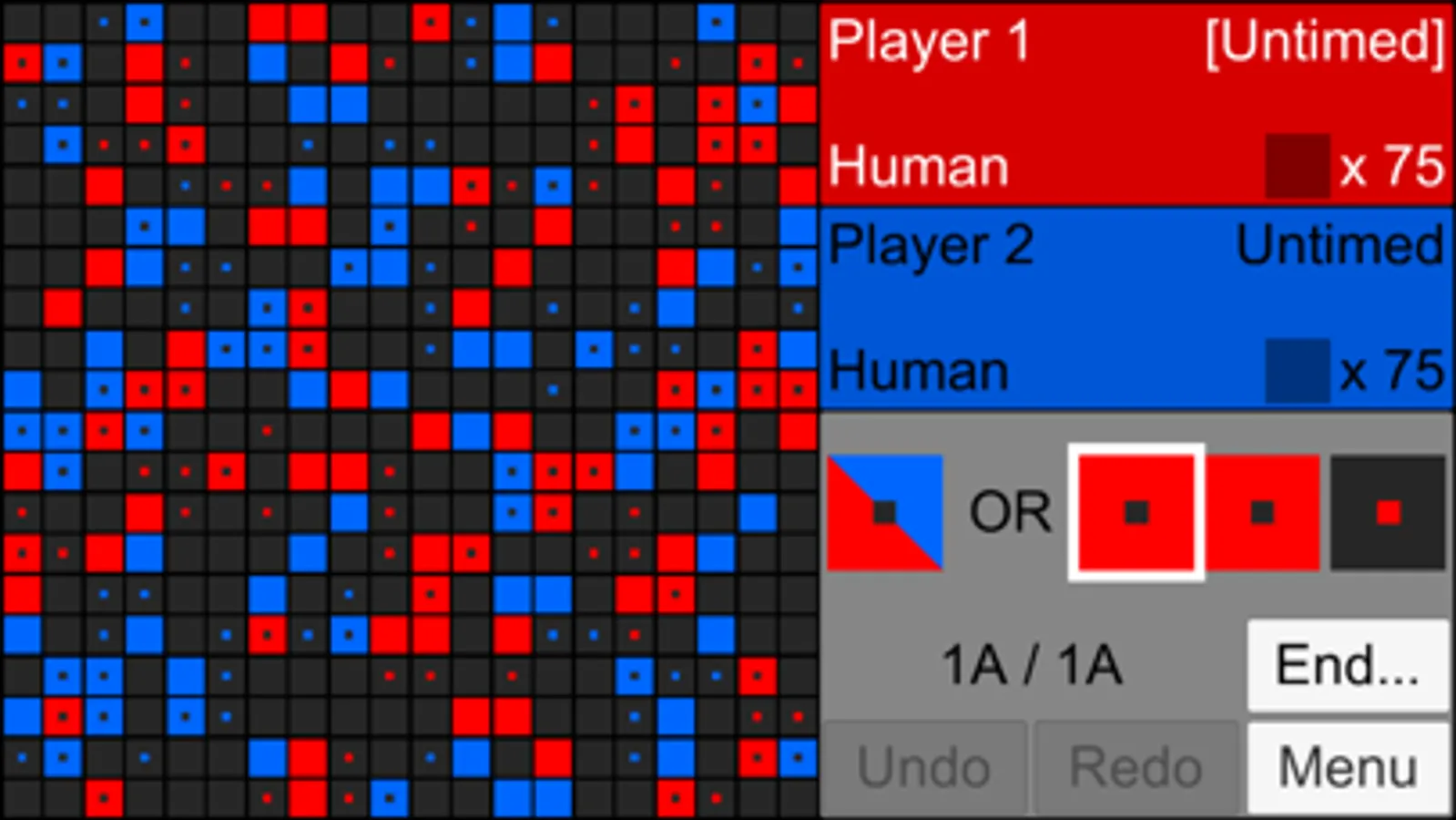In Game of Life and Death, the popular cellular automaton Conway's Game of Life turns competitive. Two players control the red and blue cells and fight to be the last surviving color. Strategies to win GOLAD can range from as simple as killing the most fertile cell, to as complex as searching through all possible moves and finding the best one. The game comes with a tutorial that is easy to follow for even newcomers to the Game of Life. This game also comes with three levels of AI GOLAD players: dumb, okay, and smart. To be honest, even the smart AI can be beaten relatively easily.