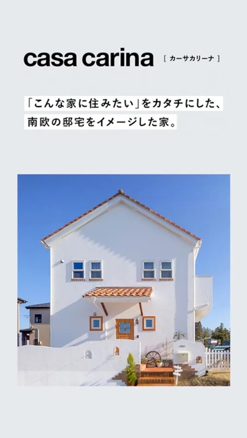家との出会いは、運命の人との出逢いに似ています。会った瞬間に心ひかれ、知るほどに好きになる。時間が経つほどに、愛着が深くなる。南欧の邸宅をイメージした「casa carina(カーサカリーナ)」は、無垢材や漆喰、テラコッタを使ったナチュラルテイストの家。ひと目惚れするインテリア性、すぐれた機能性。オリジナリティにあふれた心地良い家が家族の暮らしをときめかせます。