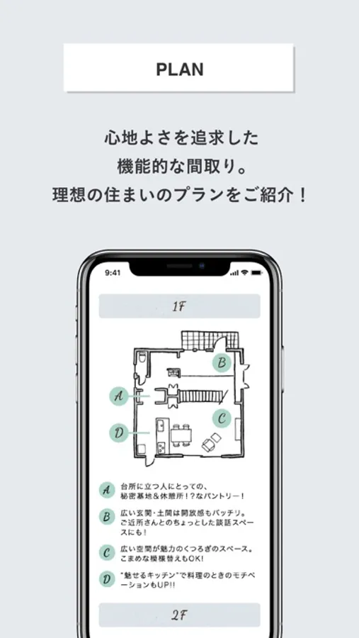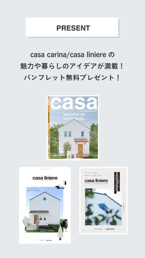 このアプリは、そんな「casa carina 」「casa liniere」の魅力をもっと手軽に見てもらいたいと思い開発しました。プランや施工事例がご覧いただけるとともに、アプリから資料のご請求も可能です!家づくりの疑問・質問などがあればお問い合わせからお気軽にご相談ください。