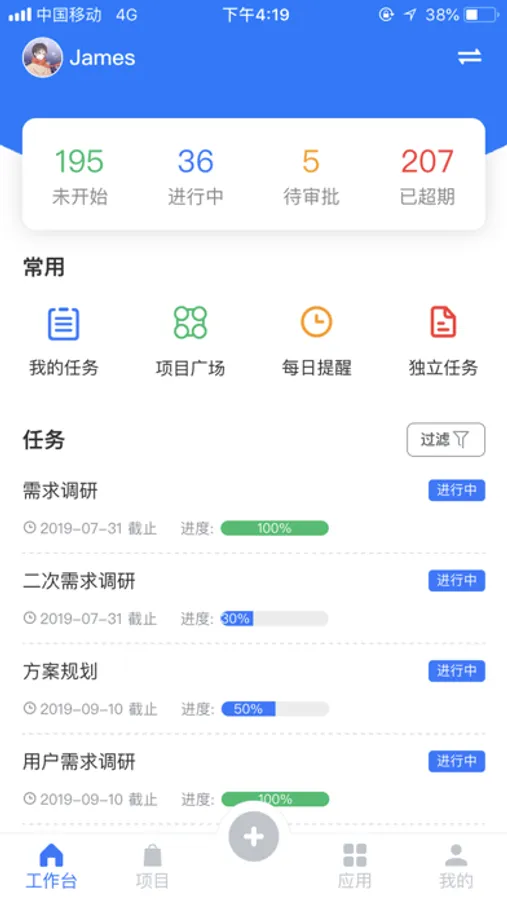 --项目看板:提供各种维度的项目、项目群、成员统计报表,让工作可视化。