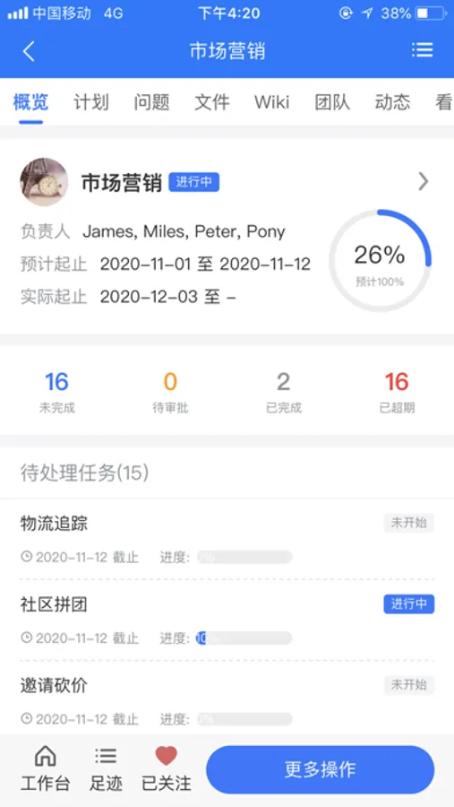 --项目计划:提供强大的WBS 项目计划、里程碑及可视化的甘特图功能,可一目了然查看每个成员的任务情况(数量及进度),以及灵活的变更管理。