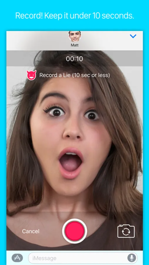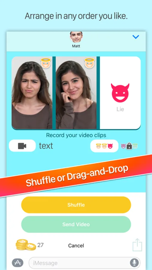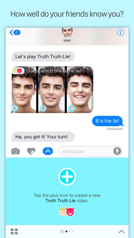 Record three short video clips: two truths (e.g. "my favorite color is blue", "I can hold my breath for fifteen seconds") and one lie ("I love kale"). Then tap Shuffle or drag-and-drop to rearrange. Finally, TTL makes a single video to send to a friend (or a group message!) for them to guess which one is the lie!