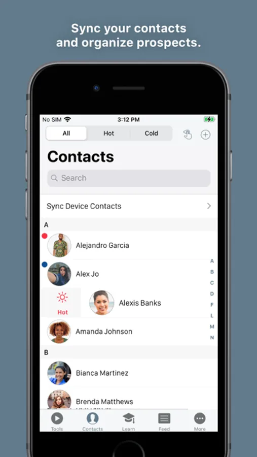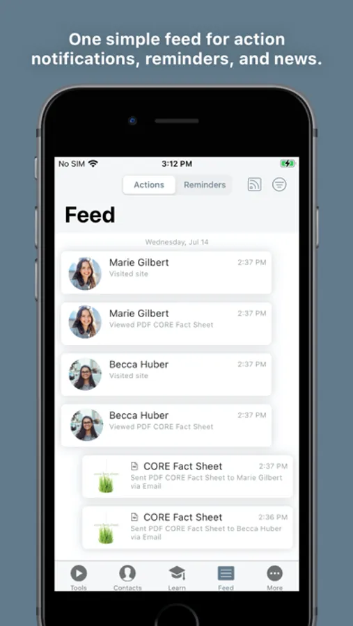 Contacts: Choose how to sync and manage your contacts. Swipe to sort them by interest level. You can make connections, add notes, or check out the Contact Feed to see the tools you’ve shared and contact actions.