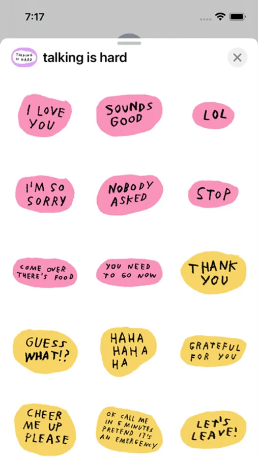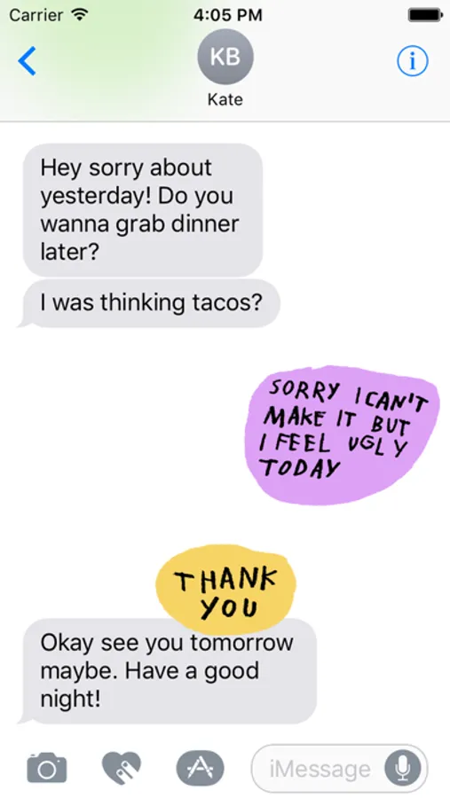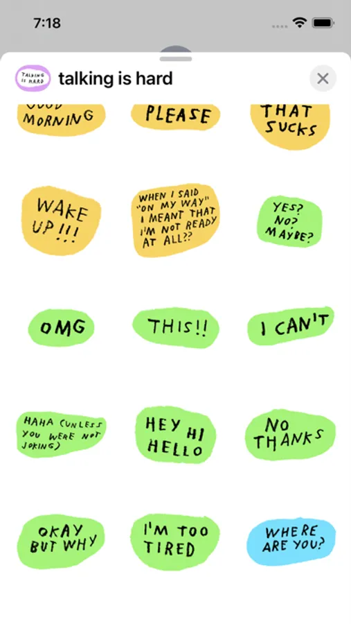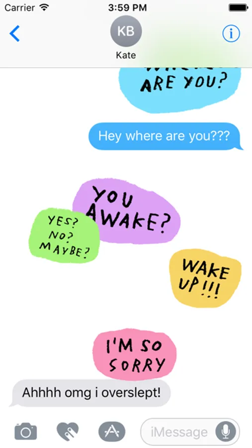 Includes classic greetings such as HEY HI HELLO when someone is taking too long to reply and I'M TOO TIRED for when you are too tired. You can even layer stickers on top of other stickers to cover even the most difficult situations, such as when you love someone but also want them to leave you alone.