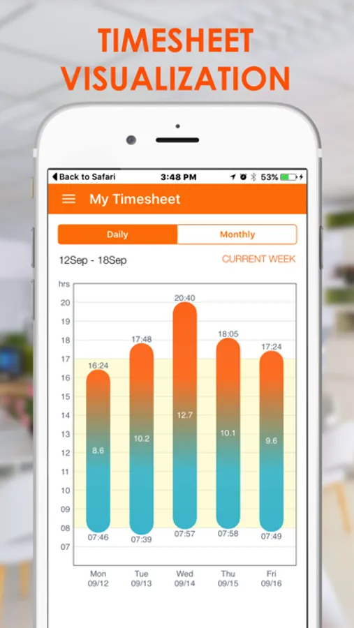 - You will be able to view personal work charts such as working hours and your working time in days, weeks and months.