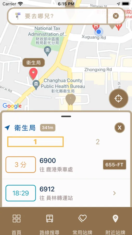 2. 附近站牌:提供目前位置附近公車站牌搜尋,顯示公車預估到站時間。