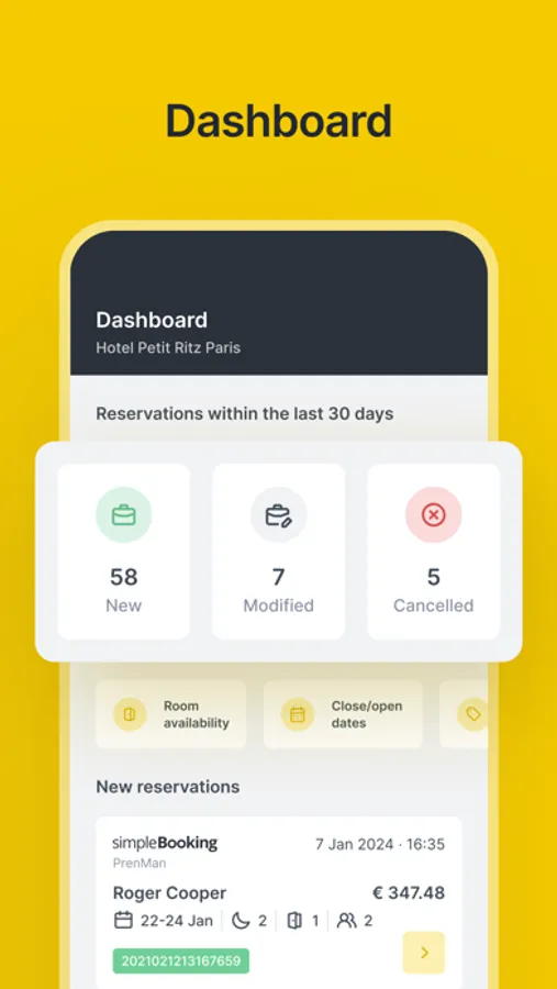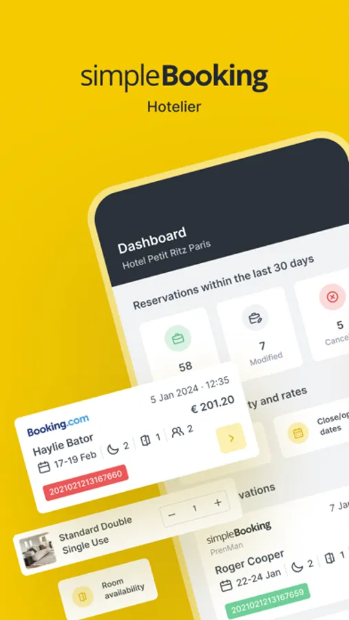 Simple Booking Hotelier App: receive notification on new reservation, modification and cancellation on all channels, updates rates and availability, close to sell dates, check daily arrival and check your reservations.