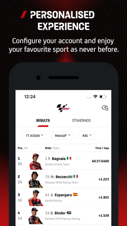 Stay in the know about your favourite riders with ease! Keep a close eye on all the news surrounding the riders you support the most. Stay up-to-date with their latest results, standings, and never miss any updates again. With the MotoGP™ Official App, you'll never lose track of your favourite riders. Stay connected and be the first to know!