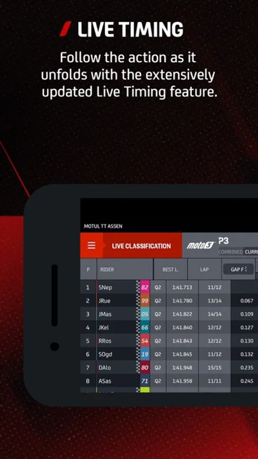 Follow the action as it unfolds with the extensively updated Live Timing feature, and watch lap times progress as the riders speed through each sector of the track. Split times, sector tracking and exclusive data allows you to see exactly how the riders are performing throughout each lap and chart the riders as their teams and mechanics do. Available to you LIVE!