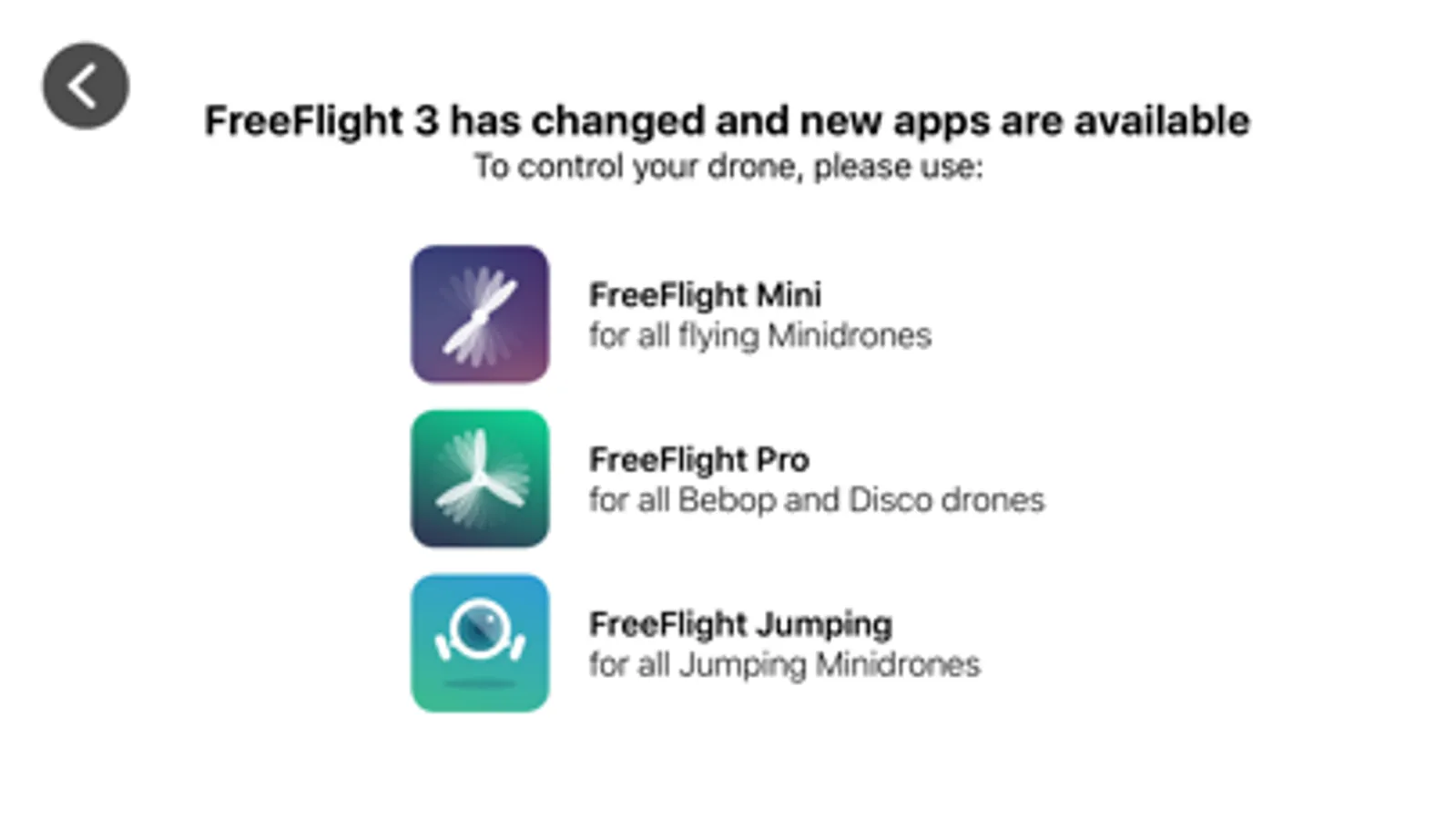 Freeflight 3 now redirects you to the right application to control your Parrot Drone or Minidrone.