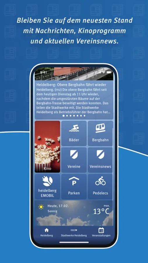 Mit für dich haben Sie den idealen Begleiter für Heidelberg und Umgebung: Ob mit lokalen Nachrichten und dem Wetter, Veranstaltungskalender, dem Kinoprogramm in Ihrer Nähe, Parkhaussuche und Parkplatzverfügbarkeit, Vereinsnews oder Informationen zu den Heidelberger Bädern und den Bergbahnen inklusive Ausflugtipps – das praktische Multitalent versorgt Sie stets aktuell.