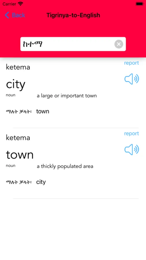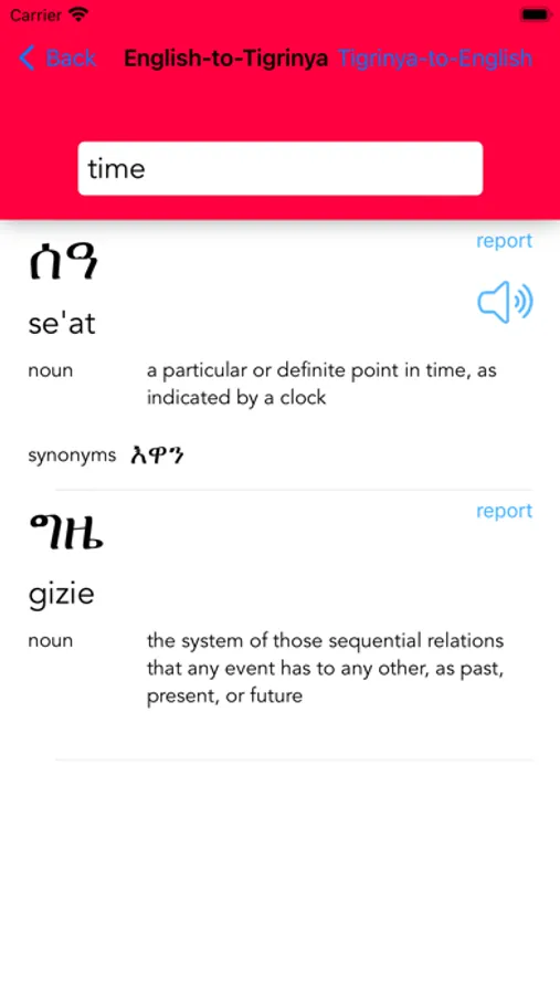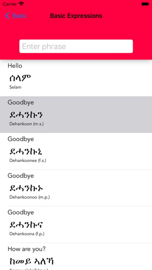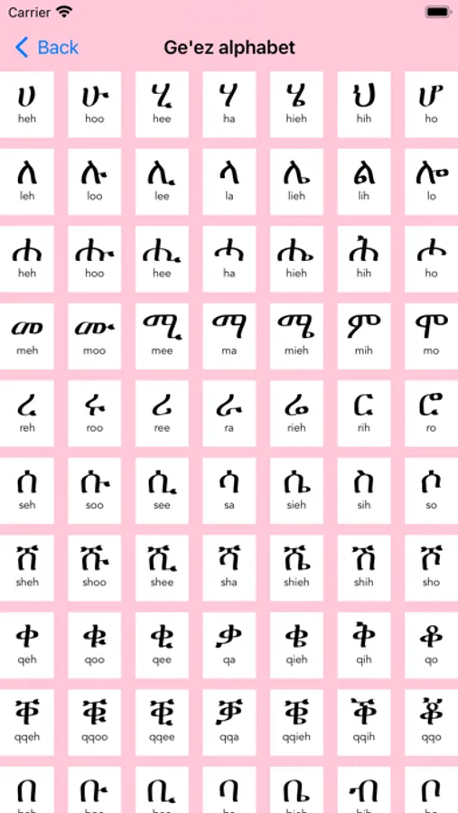 A basic Tigrinya grammar and dictionary app. Features the Ge'ez alphabet with pronunciation, a Tigrinya-English translation dictionary (both directions), and basic grammar and phrases.