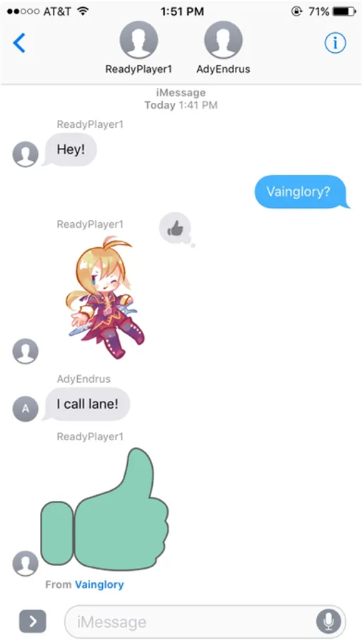 Vainglory has brought all of your favorite heroes to iMessage in sticker form. Now you can coordinate with teammates, talk strategy and party up with a roster of hero stickers. Download Vainglory Stickers for iPhone, iPad and iMessage on the App Store for iMessage!