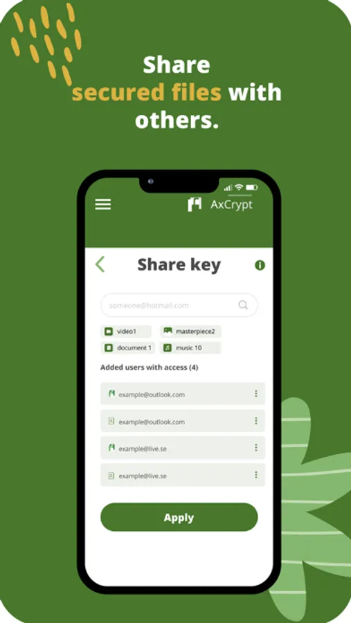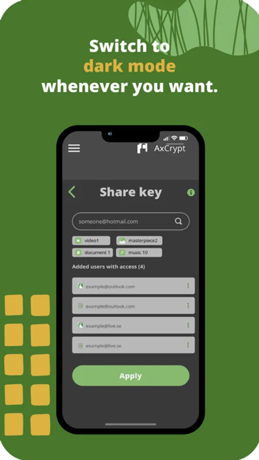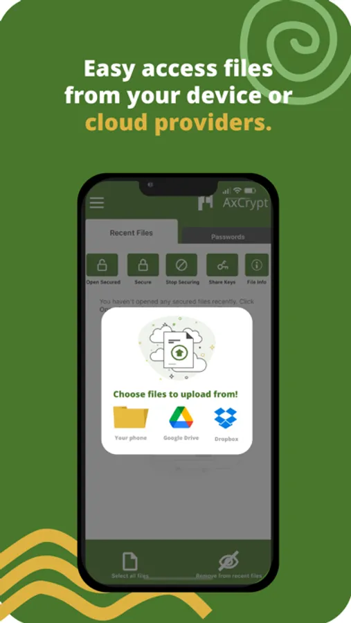 With the AxCrypt application, you can view any file accessible on your phone, you can key share access to files with our market-leading key-sharing feature and you can encrypt and decrypt files on Google Drive, OneDrive, and Dropbox (no hassle, it works the way you expect). More platforms are coming soon.