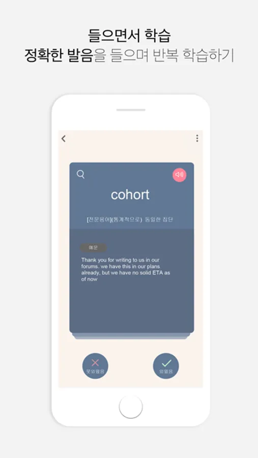 ‘들으면서 학습’기능은 단어의 올바른 발음을 반복하여 청취하며 학습할 수 있도록 도와줍니다.