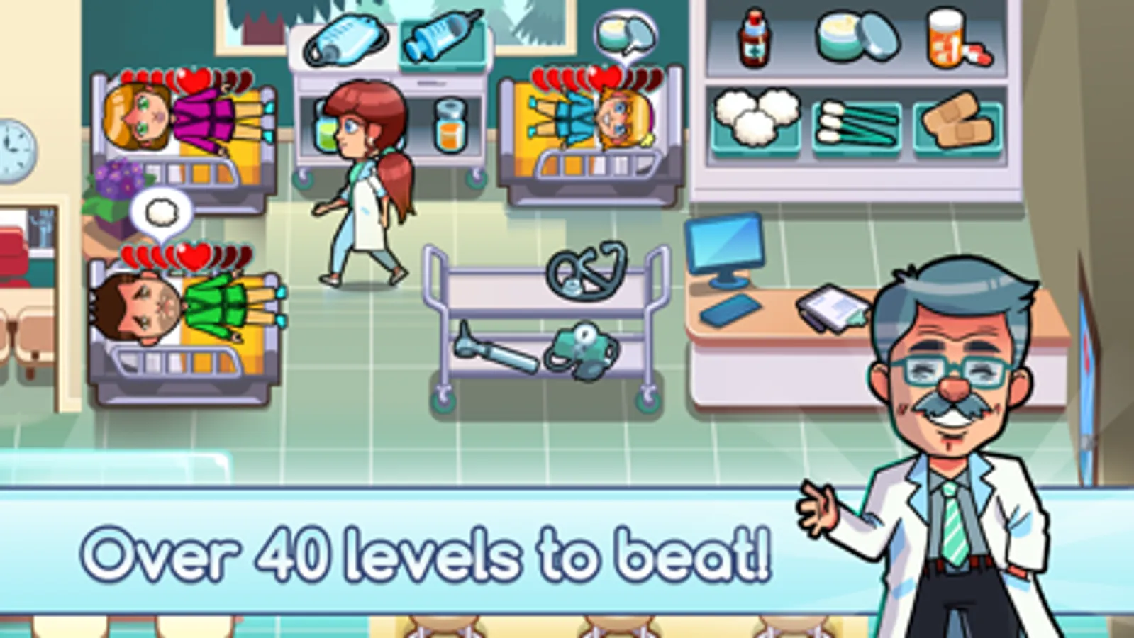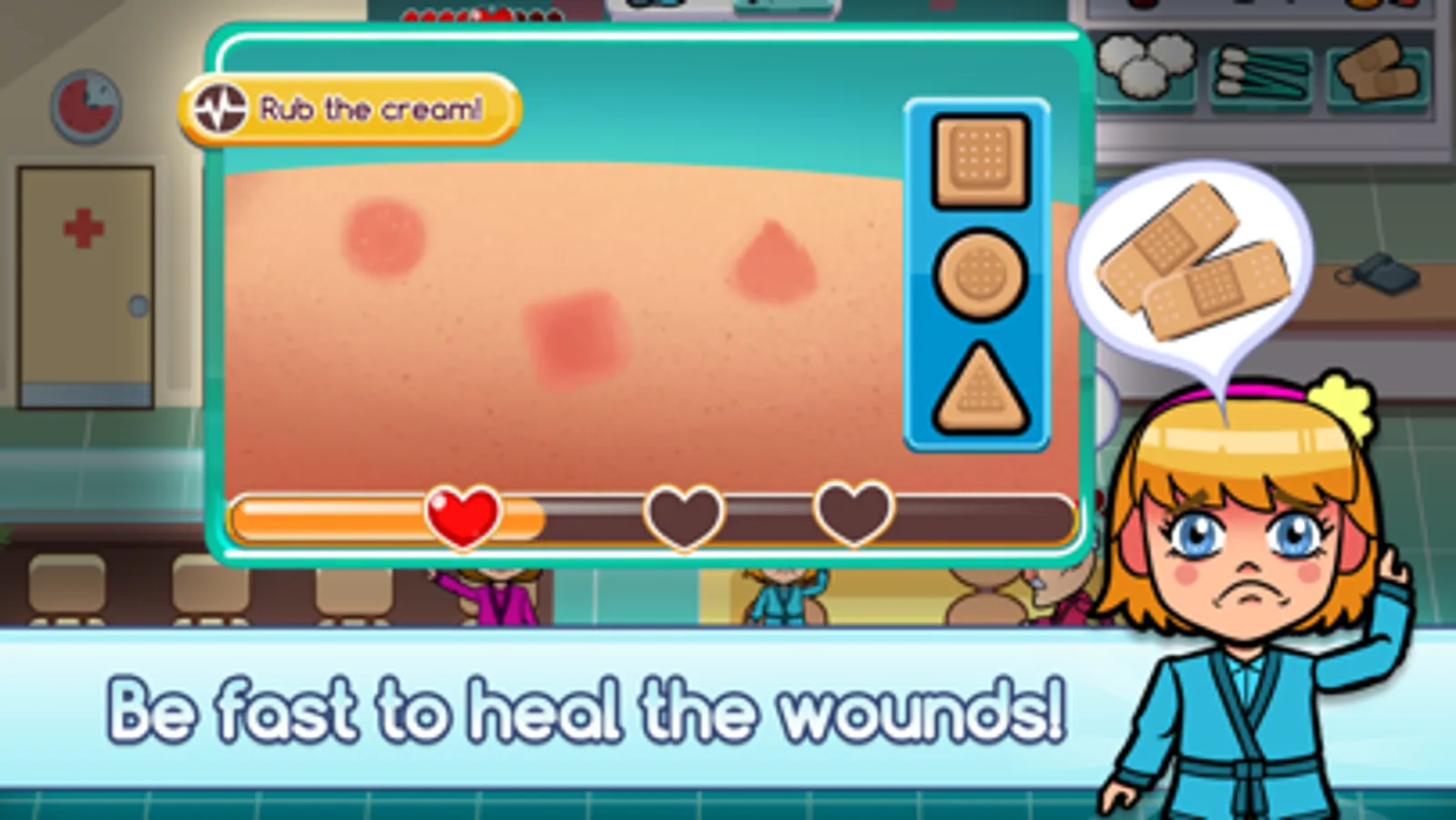 You will be responsible for taking care of several patients with different diseases, from a very annoying dirty ear to a serious case of frozen heart, you are the key to their CURE! Watch out for patients with high blood pressure and muscle pain and become a great NURSE!