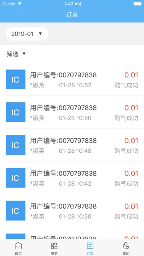 4. 雁过留痕。每笔订单记录,无需翻阅纸质账单,就能查阅所有往期燃气使用记录。