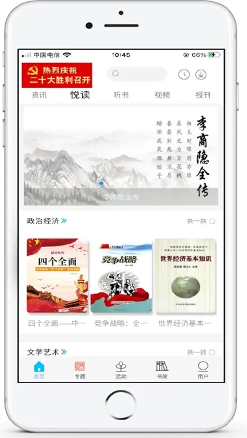 听书:特色听书模块,提供文学名著、历史军事、亲子少儿、名家曲艺、都市言情、武侠悬疑等音频;