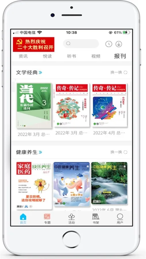 报刊:提供文学经典、健康养生、科技军事、美食烹饪、智慧生活、亲子育儿等报刊资源;