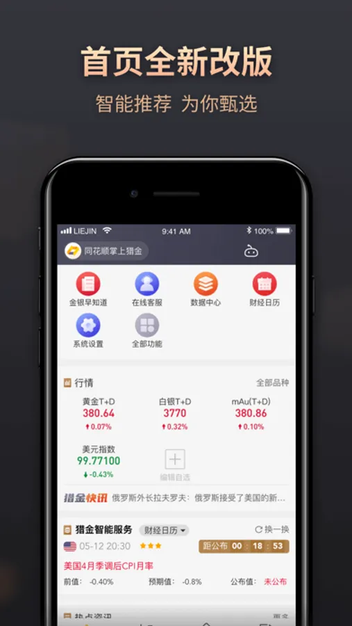 掌上猎金是由同花顺(股票代码:300033)旗下杭州猎金信息技术有限公司研发的一款贵金属App。我们为您提供智能投资服务,以及黄金,白银等多市场的实时行情报价。精选贵金属市场热点资讯及国内外市场动态。平台安全、专业,同花顺(上市公司)旗下黄金业务公司,专注投资服务20年