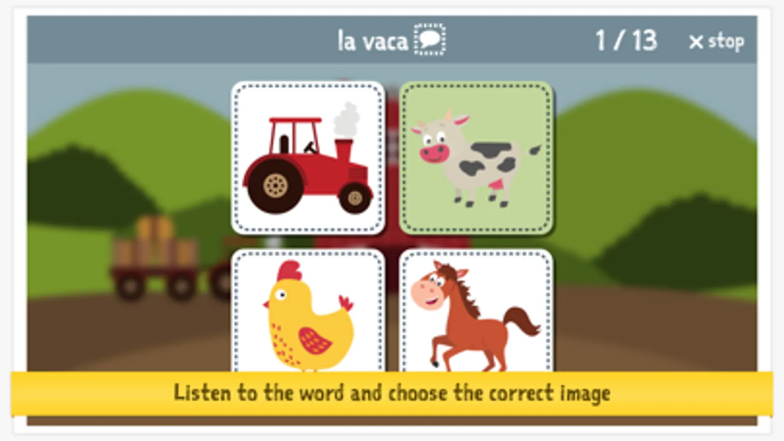 Words: tractor, vaca, pollo, caballo, gato, perro, pato, and 6 more!