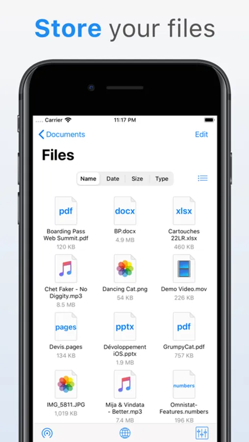 PDF, DOC, DOCX, XLS, XLSX, PPT, PPTX, KEYNOTE, NUMBERS, PAGES, CSV, WEB ARCHIVE, MP4, M4V, MOV, 3GP, 3GPP, WMV, MP3, AIF, AIFF, M4A, M4R, WMA, WAV, FLAC, JPG, JPEG, TIF, TIFF, PNG, GIF, BMP, TXT, HTML, XML, ZIP, RAR and a lot more...