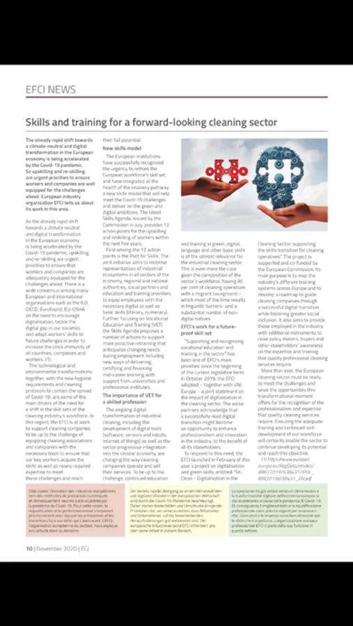 European Cleaning Journal is the only pan-European magazine covering the professional cleaning industry – covering the away-from home market for cleaning and hygiene. Sectors covered include contract cleaning, hospitals, retail, manufacturing, local government, hospitality and distributors.