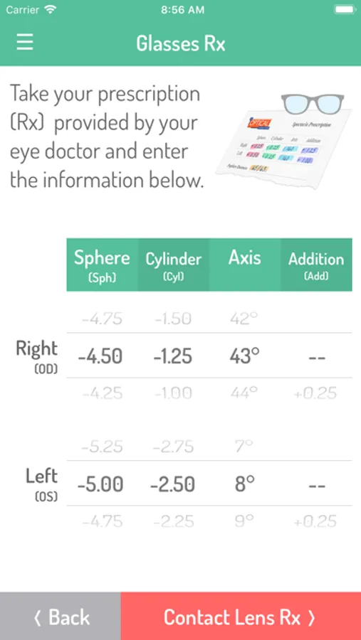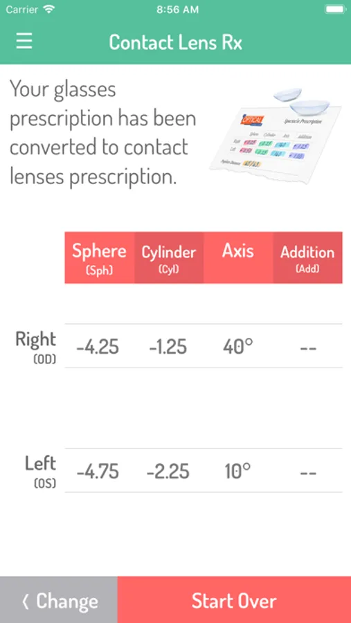 Note: Contact Lens Rx app is not intended to be a substitute for your eye care professional. While the results provided are adequate for most people, an eye care professional can provide a more in-depth analysis during your examination.