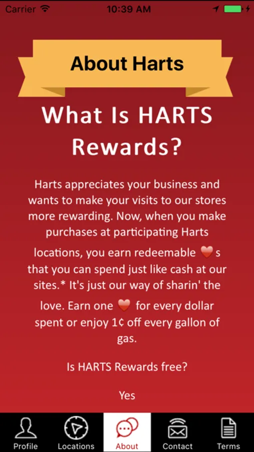 Stay on top of your Harts Rewards with the Harts Gas and Food app! This dynamic app for iPhone® and iPad® keeps track of your transactions as well as the number of Harts Rewards points earned every time you make a purchase at a participating merchant. Plus, the handy Harts store locator enables you to find participating Harts Rewards merchants across the country, along with information for each Harts Gas and Food location.