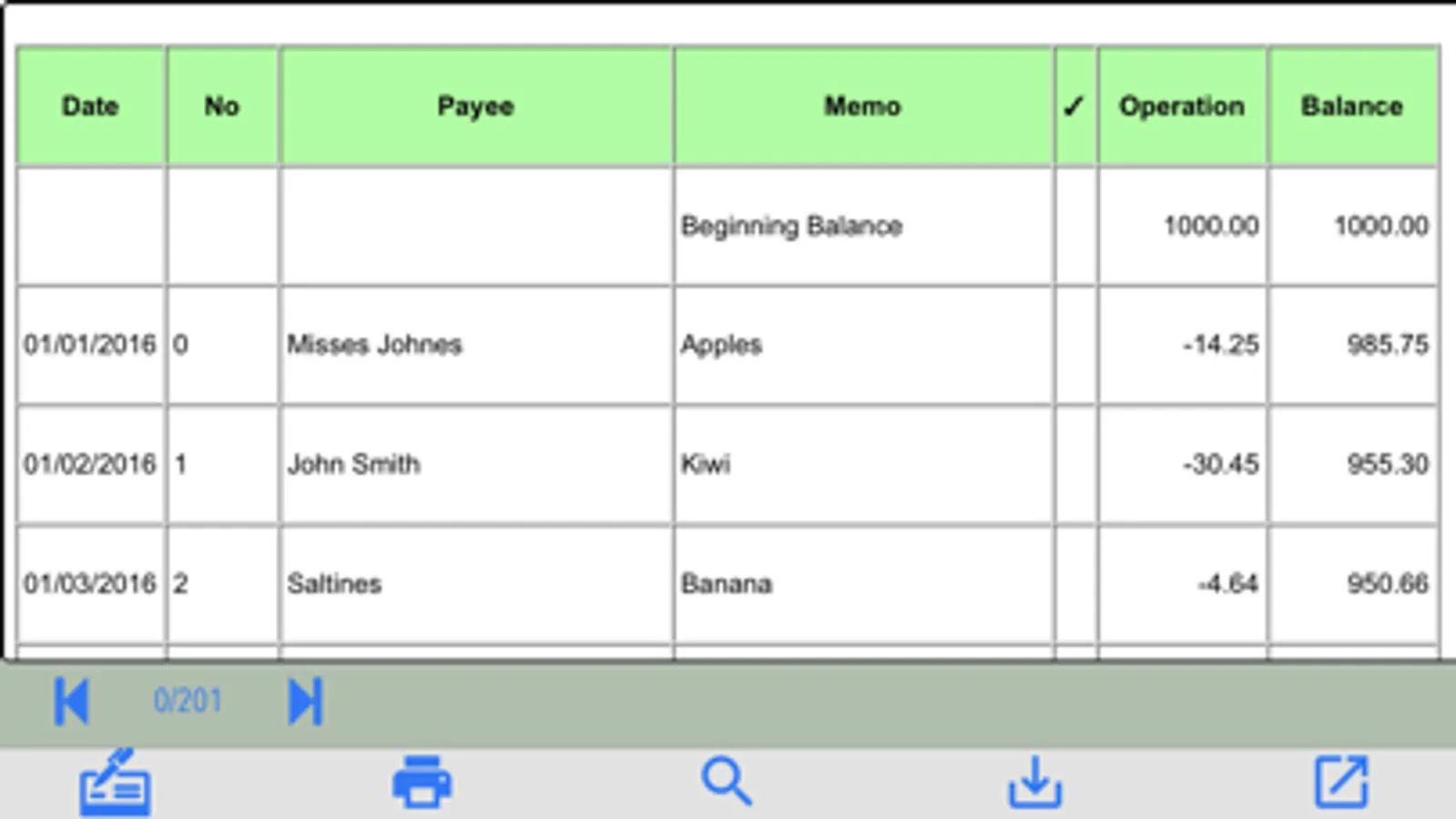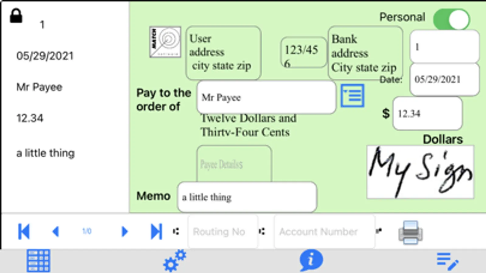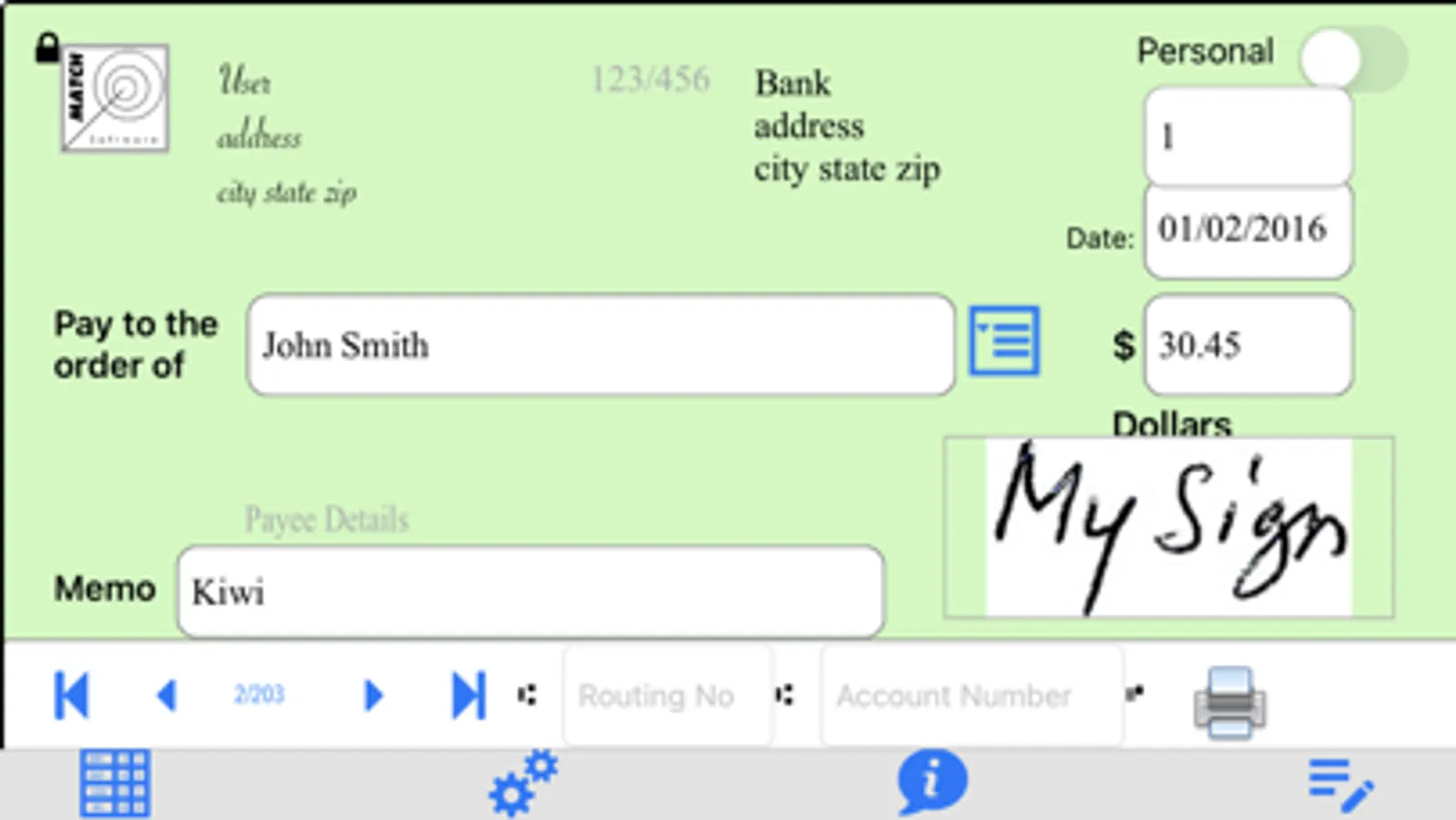 Keep track of all your expenses and deposits with the built-in electronic record book (Register). Balance is calculated automatically. Reconcile with your bank statement just as easily as you would with a paper record book. Save, load data and settings to use different accounts. Set different fonts to print your name on checks.