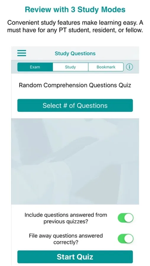 -Study/Exam/Bookmark modes are available for NPTE-style review questions.