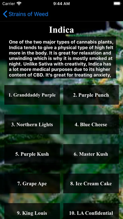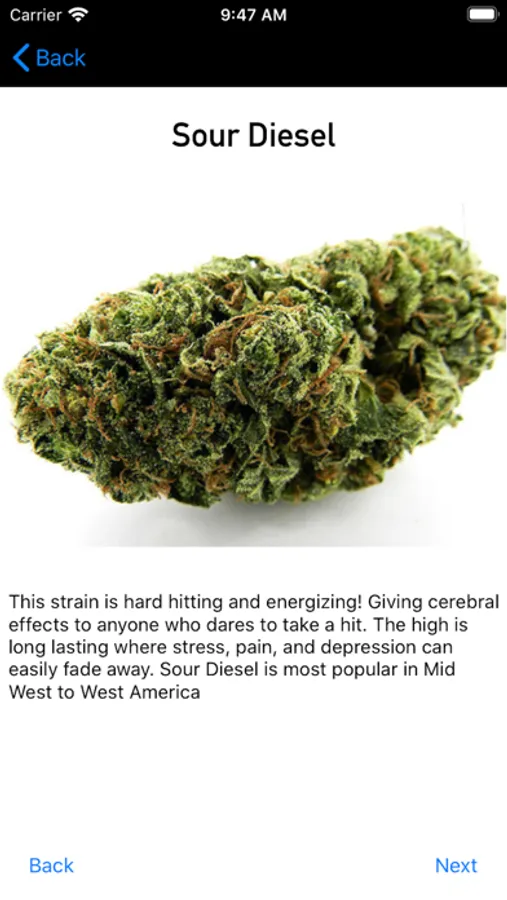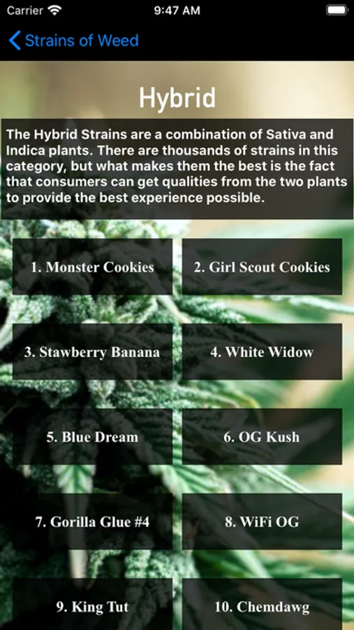 Strains of Weed is categorized by Sativa, Indica, and Hybrid plants and lists/explains the most popular strains used in the world. With this app you will be able to find the perfect type of weed that fits your expectations for a great high. The info for each strain includes its benefits, effects, and availability along with some extras. Each strain has a picture, and the app contains 30 different types of strains so anyone can find their favorite or begin to know what they are looking for. With a simple and clear design, this is the fastest and easiest way to learn about different weed types.