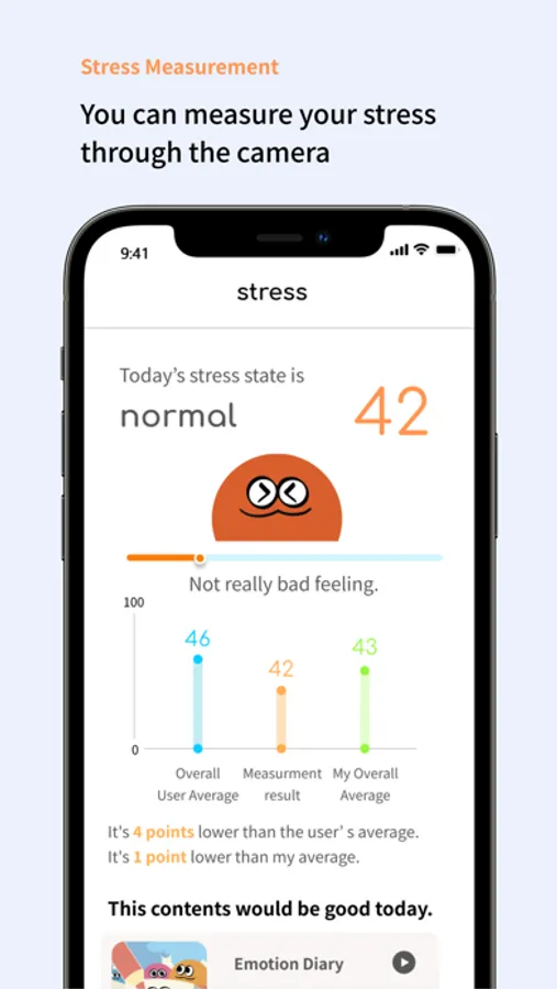 The PPG and optical pulse wave measurement technology used to measure stress is a mobile implementation of the measurement method used in actual medical devices. Measure the changes in blood flow through the user's fingers through the camera and flash on the phone. Through this, the overall stress state of the user is shown by deteriorating the activity of the nervous system such as autonomic nerve activity and balance.