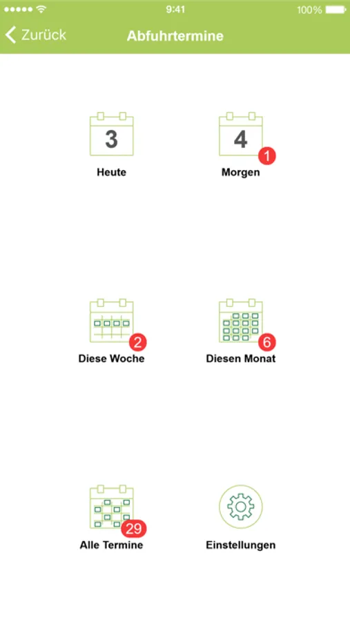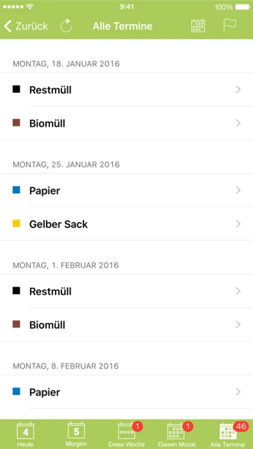 - Erinnerung für alle Abfuhren und Sammlungen wählbar (Restmüll, Bioabfall, Gelber Sack, Papiertonne, Vereinssammlung Papier, Sperrmüll, Möbelholz, Altmetall, Kühlgeräte, Schadstoffe, Christbäume)