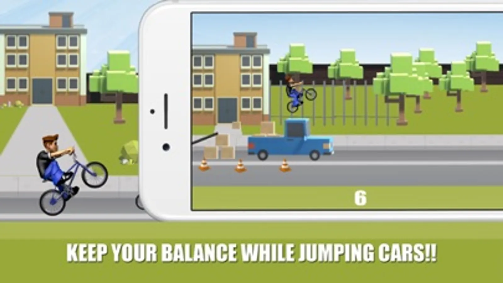 Jump over cars, and keep your balance on landing.