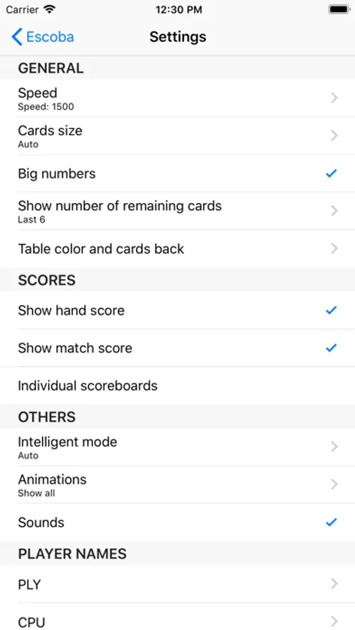 - Settings: Cards size, cards back color, sound, scoreboards, table and scores color, cards numbers size, animations,...