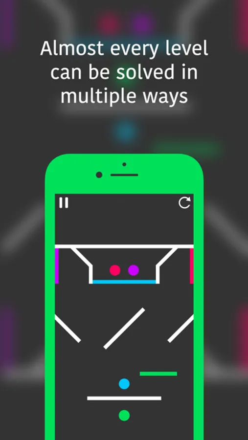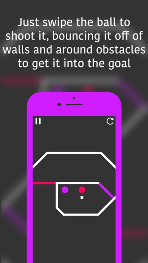 Just swipe the ball to shoot it in the direction you want, bouncing it off of walls and around obstacles to get it into the correctly colored goal. Be careful, though — you can only bounce the ball a few times each level! Almost every level can be completed in more than one way. Levels are as minimalistic as possible allowing you to spend less time figuring out what you're looking at and more time solving the puzzle.