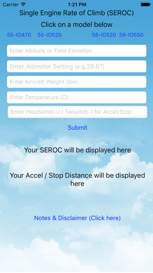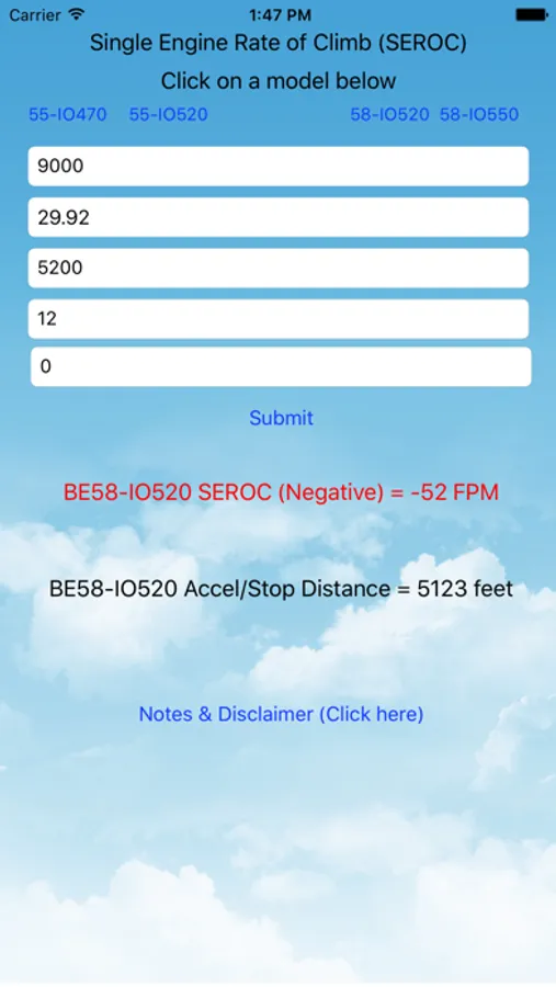 Note: You must have software version 12.0 or greater on your iPhone/iPad. This app takes the single engine rate of climb (SEROC), the Accelerate/Stop (Accel/Stop), and the Single Engine Service Ceiling (SESC) charts in the Beech POH and converts them to a simple, quick, and easy way to estimate your SEROC, Accel/Stop distance & the Single Engine Service Ceiling (SESC) for the Beech Baron's 55/58 on your iPhone /iPad with IO470, IO520, or IO550 engines. The app now will also calculate the SEROC, Accel/Stop and the SESC for the BE58P Baron. The app is NOT applicable for the BE55 1961-1963 models, or the BE56/58TC Barons. Accuracy + or - 50 FPM for the SEROC, + or - 100 feet for Accel/Stop and + or - 200 feet for the Single Engine Service Ceiling (500' for the BE58P). Any mods done on your aircraft that affect performance or weight limits are not considered in the calculations. To see the user reviews, click on "Reviews", then "All Versions".