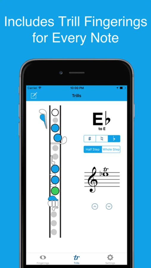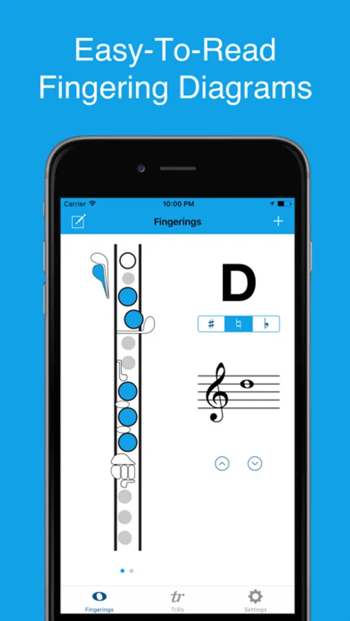 If you are just beginning to learn the flute, fingerings for notes from C4 (middle C) to G5 (the G on top of the staff) are included for free. Fingerings for other notes, as well as trill fingerings, adding comments, and adding custom fingerings, can be unlocked with a one-time in-app purchase.