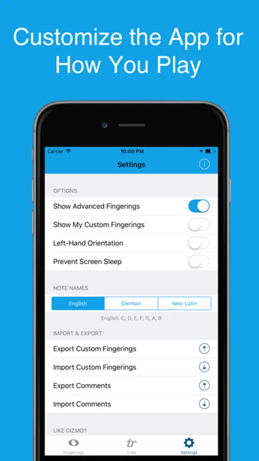 Gizmo provides quick access to the fingerings for every note on the Boehm-system flute, from low B all the way up to high G. You'll never have to lug out a fingering book again! In addition, this app includes the standard trill fingerings for every note, in both half- and whole-step increments.