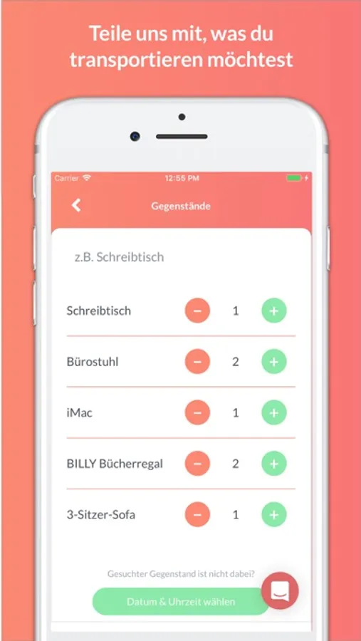 1. Informationen angeben - Erkläre uns mit ein paar Klicks, was du wann von A nach B transportieren willst. Je nach Wunsch hilft der Fahrer beim Tragen oder bringt noch einen weiteren Helfer mit.