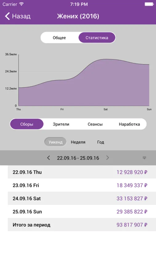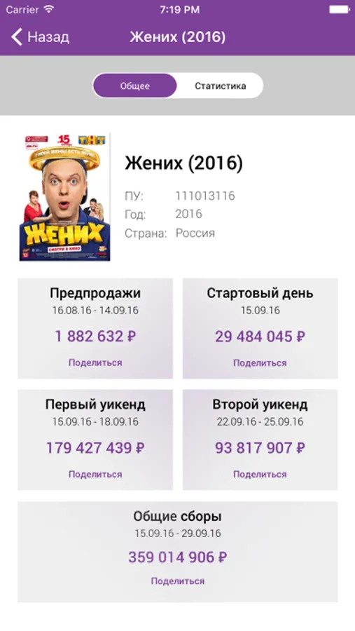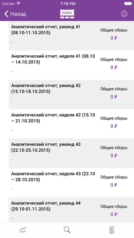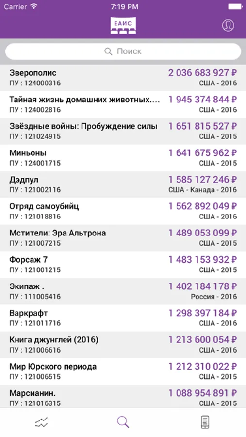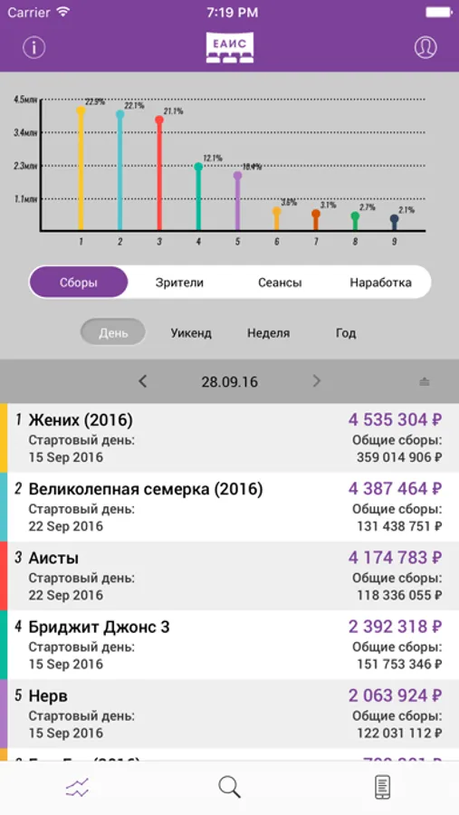 Приложение Фонда кино по работе с ЕАИС – это открытый аналитический отраслевой ресурс, в котором собраны воедино оперативные и достоверные сведения о состоянии внутреннего кинопроката России. Сколько зрителей привлек в кинозалы конкретный фильм? Какую сумму заработал в первый или второй уикенд? В приложении доступна динамика сборов, посещений, сеансов фильмов с детализацией до часа в режиме «онлайн», а также удобная графическая интерпретация данных. Специальные функции для правообладателей, кинотеатров и киносетей позволяют всегда быть в курсе результатов своей работы.
