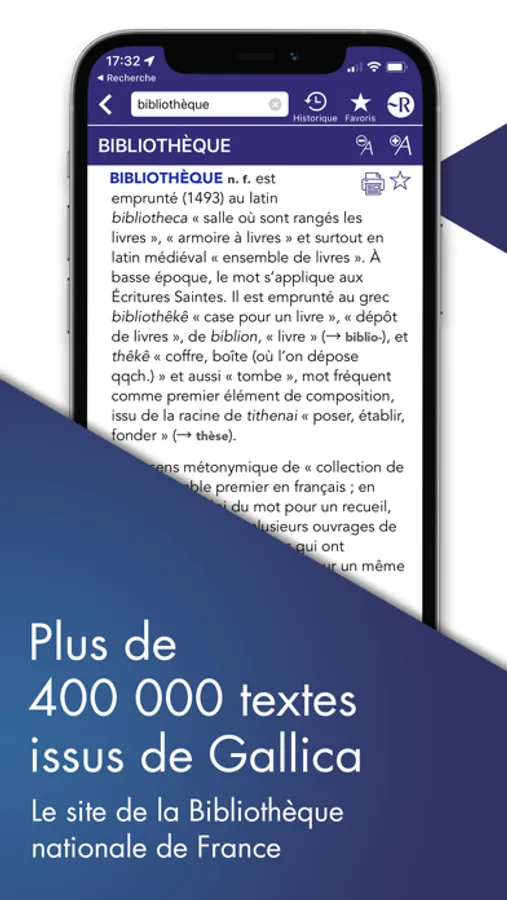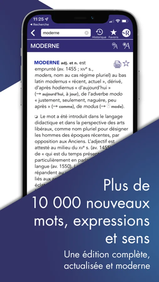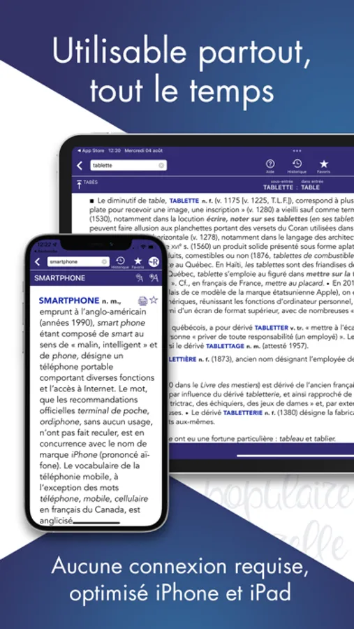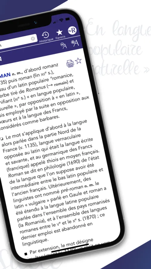 Pour la toute première fois disponible en application, le Dictionnaire historique de la langue française offre un confort de lecture et d’utilisation unique :